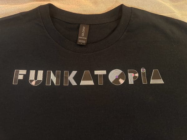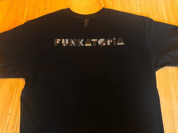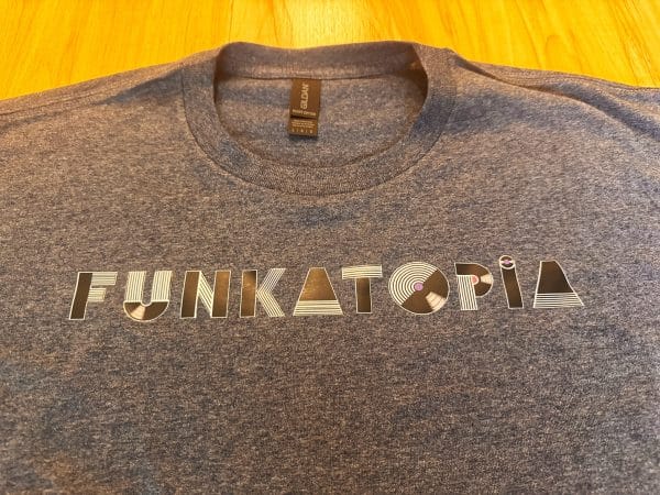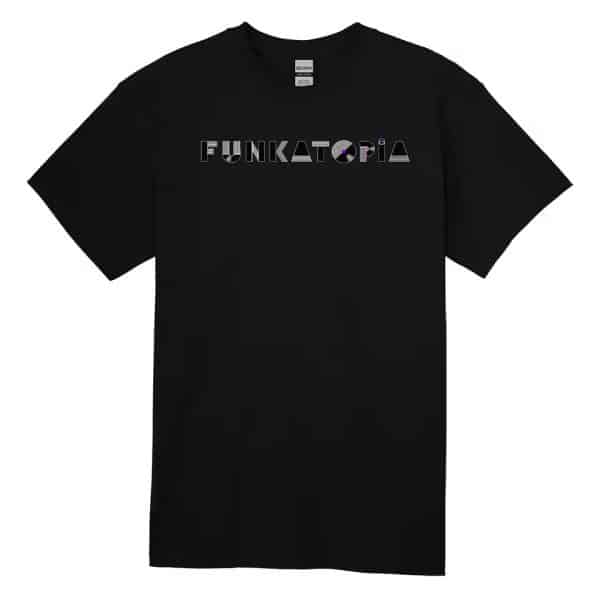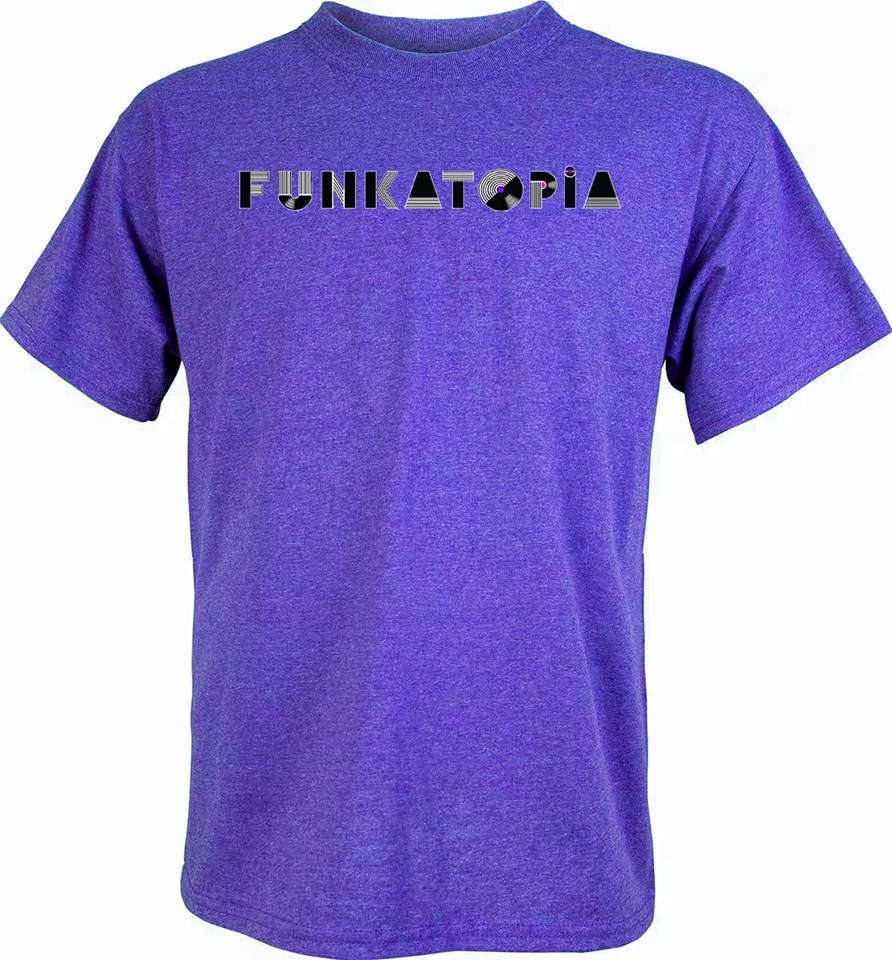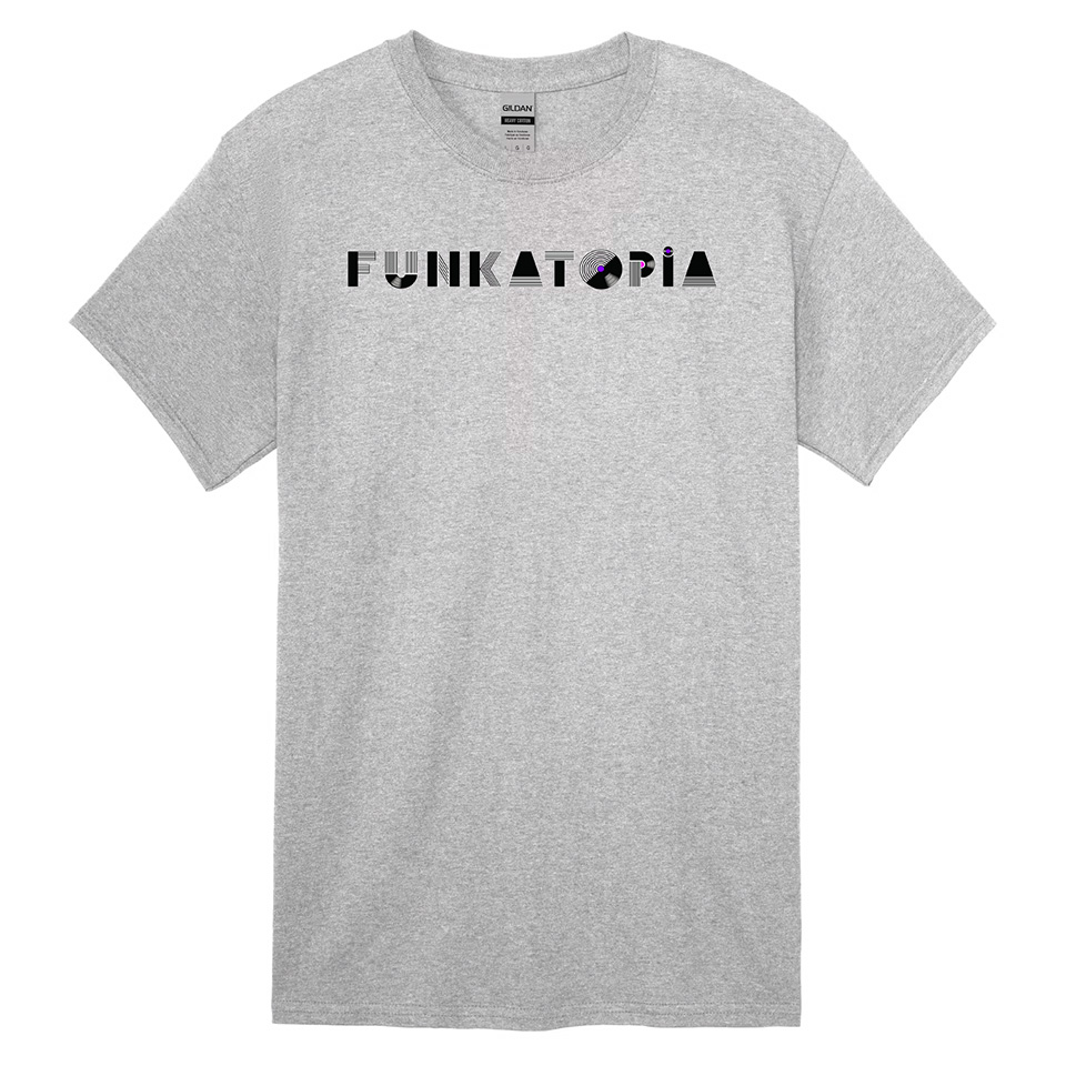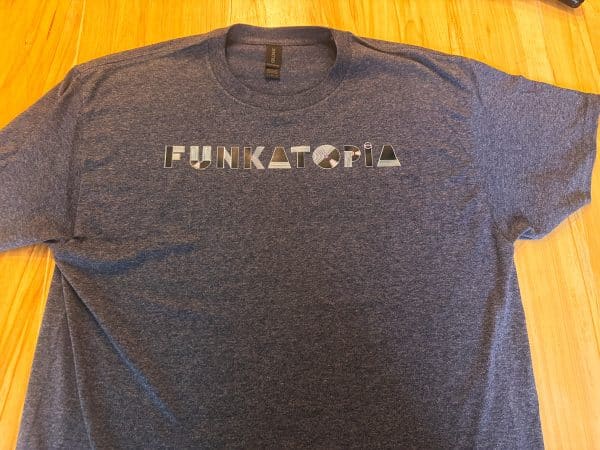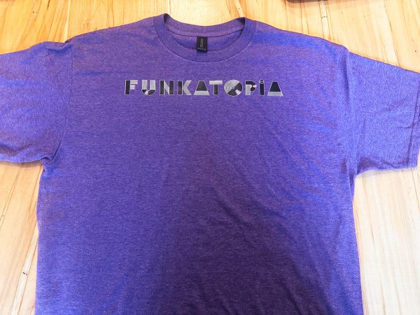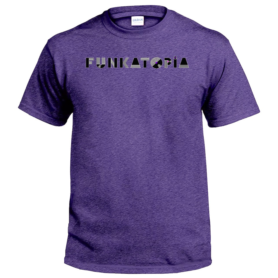 These brand new t-shirts feature the new Funkatopia text logo across the chest and are very durable wash after wash. The transfers are on a Gildan 50/50 cotton/poly blend and are available on a wide variety of colors and sizes.