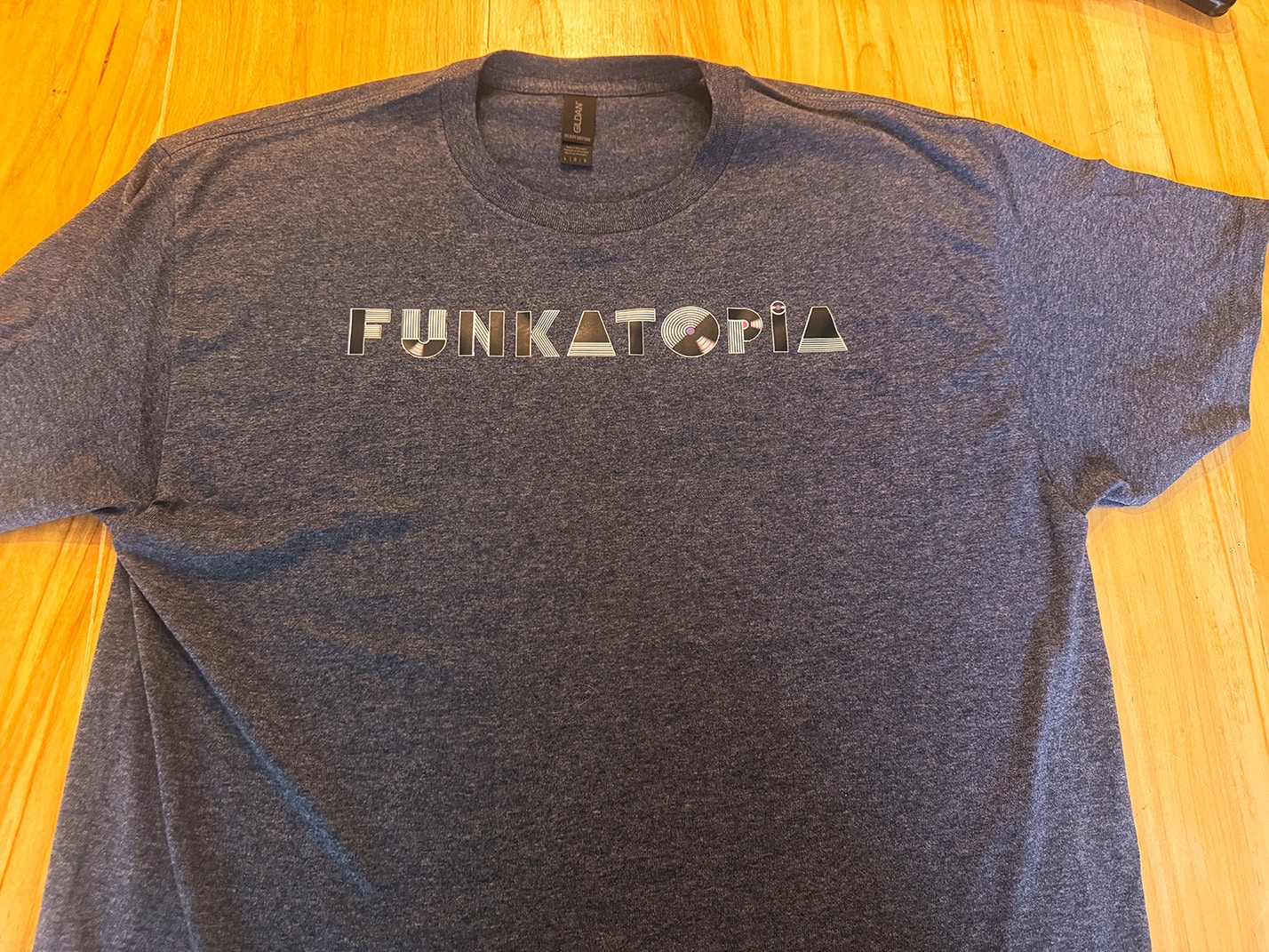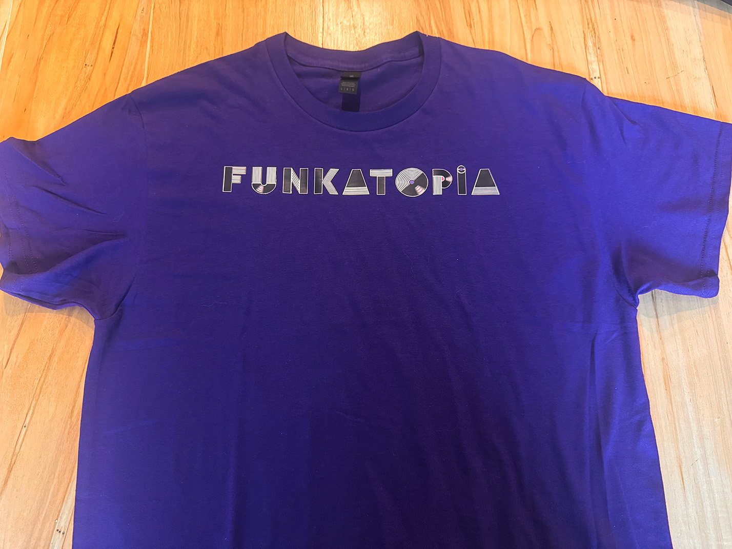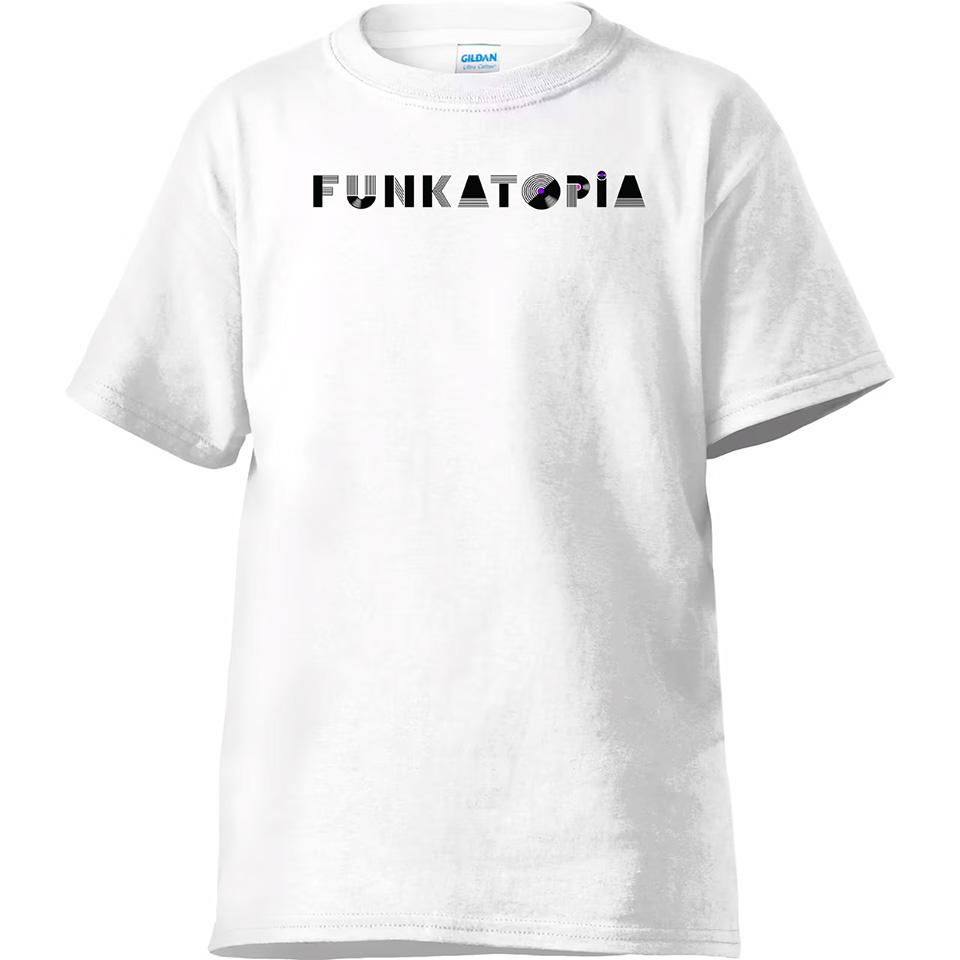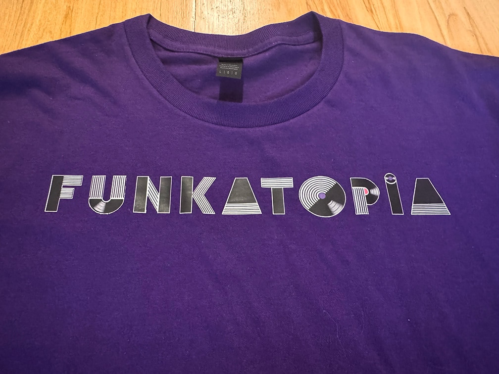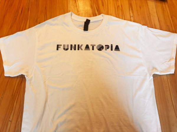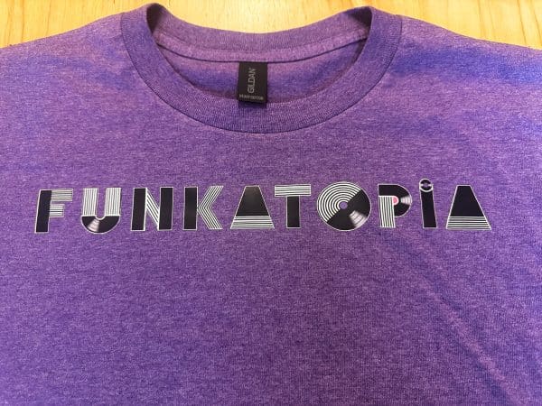 These brand new t-shirts feature the new Funkatopia text logo across the chest and are very durable wash after wash. The transfers are on a Gildan 50/50 cotton/poly blend and are available on a wide variety of colors and sizes.